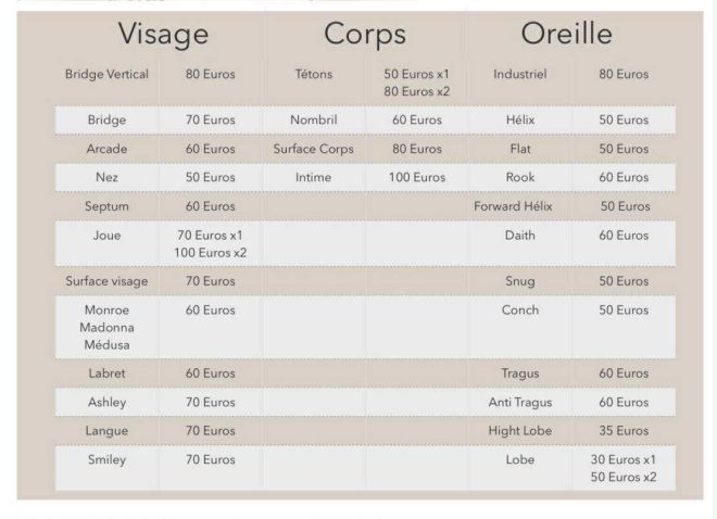 Tout les piercings peuvent être également en version or ou avec une finition plus rafinée pour un supplement de 10 a 20 euros selon le bijou a voir directement sur place .